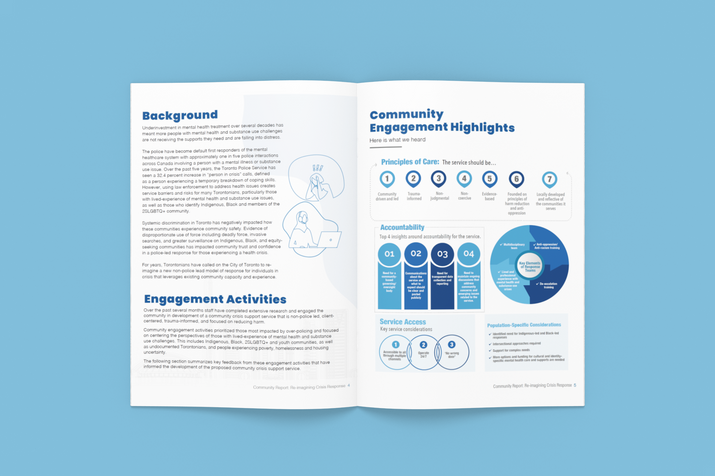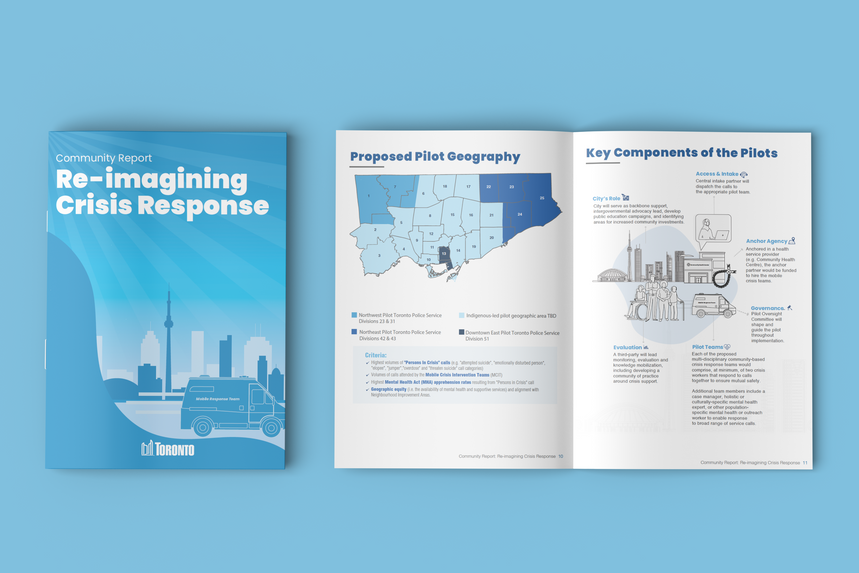 In 2021 The City of Toronto launched four new community crisis support service pilots to test a non-police approach to non-emergency calls. This interactive report was designed to highlight the key details of the pilot program through custom infographics and illustrations.